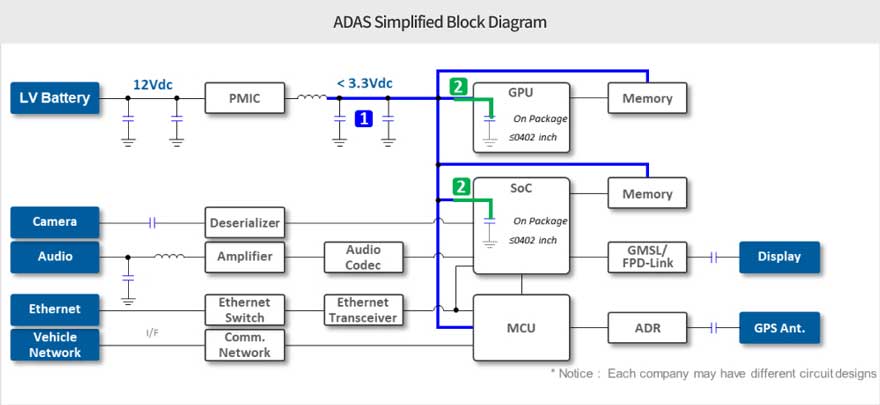 As ADAS SoCs evolve, there is a growing need for MLCCs which offer both high capacitance and low ESL characteristics for stable SoC operations under high power/high frequency circumstances. As the switching frequency of SoCs increases, loop inductance generates high-frequency noise, which is suppressed by MLCCs.