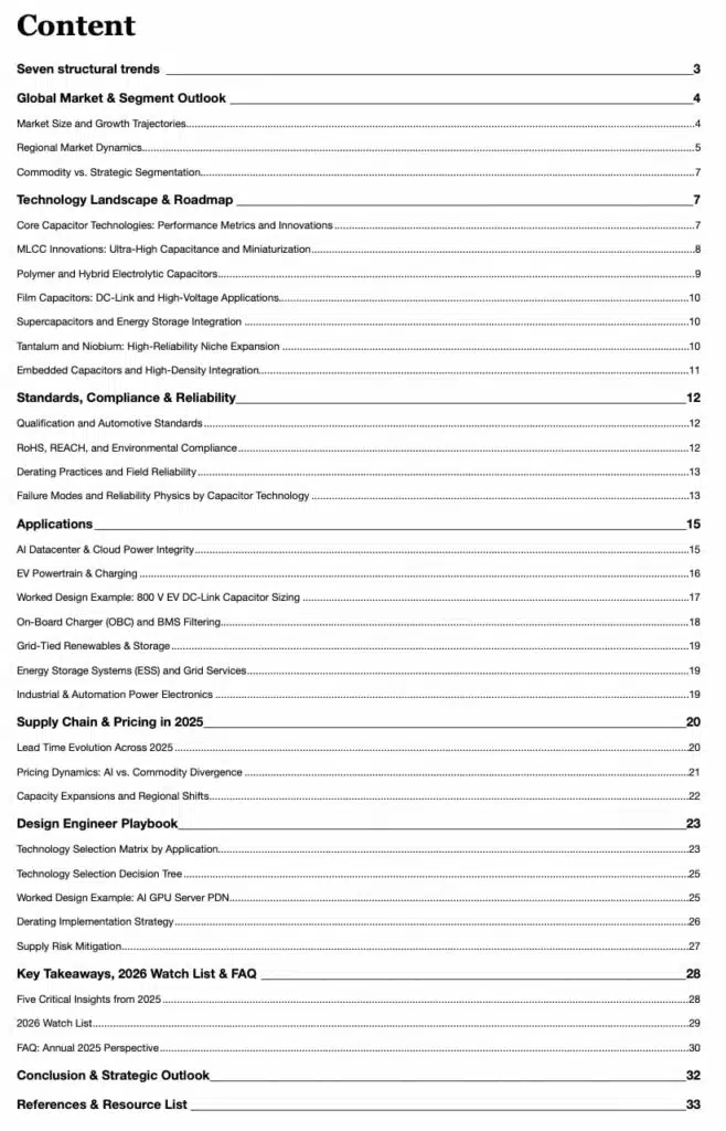 The Annual Technical Dossier is an in-depth, year-in-review intelligence publication that focuses on a specific passive component type as strategic enablers, rather than mere commodities. It compiles comprehensive market data, vendor roadmaps, standards updates, and application case studies into a single technical reference for the year and beyond.