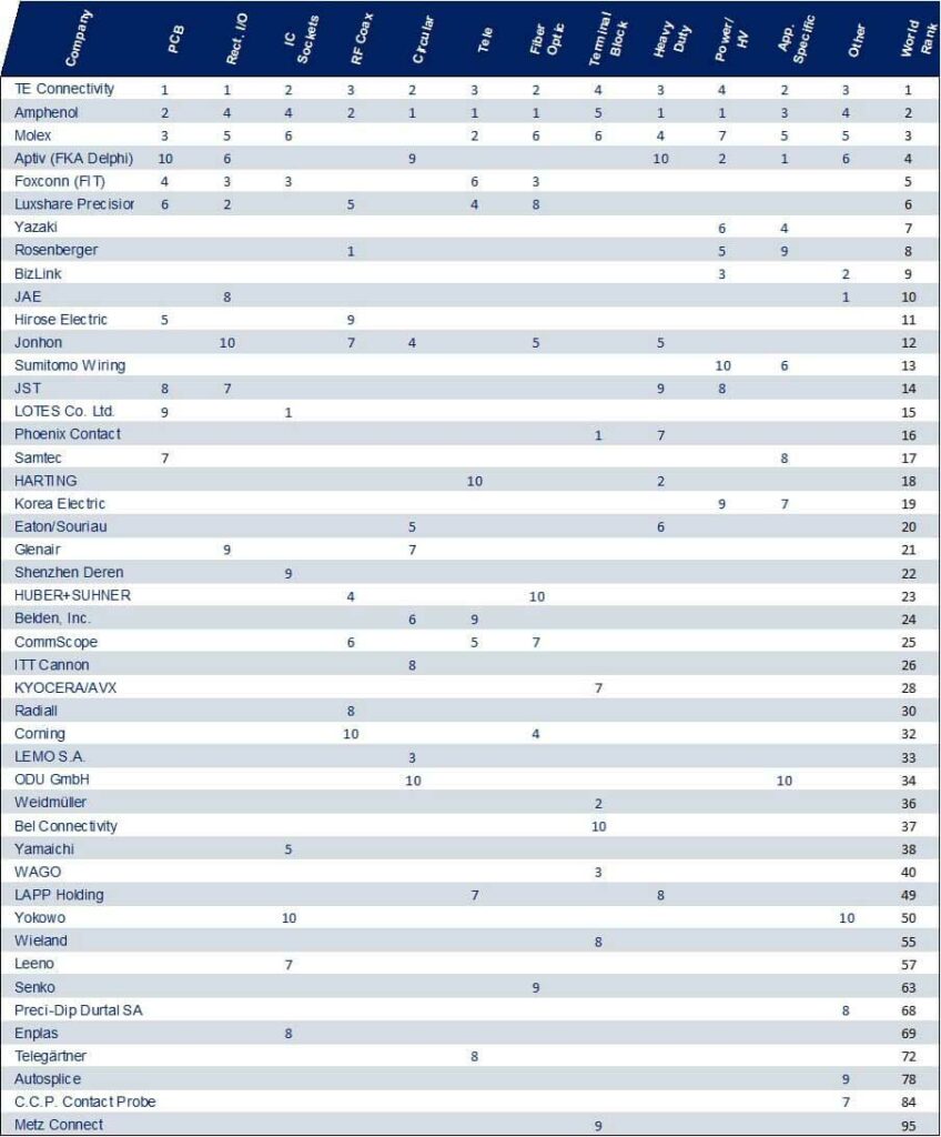 Bishop & Associates, a leading market research firm specializing in the electronic connector industry, presents in its TTI MarketEye article the world’s top 10 connector manufacturers ranked by product type.