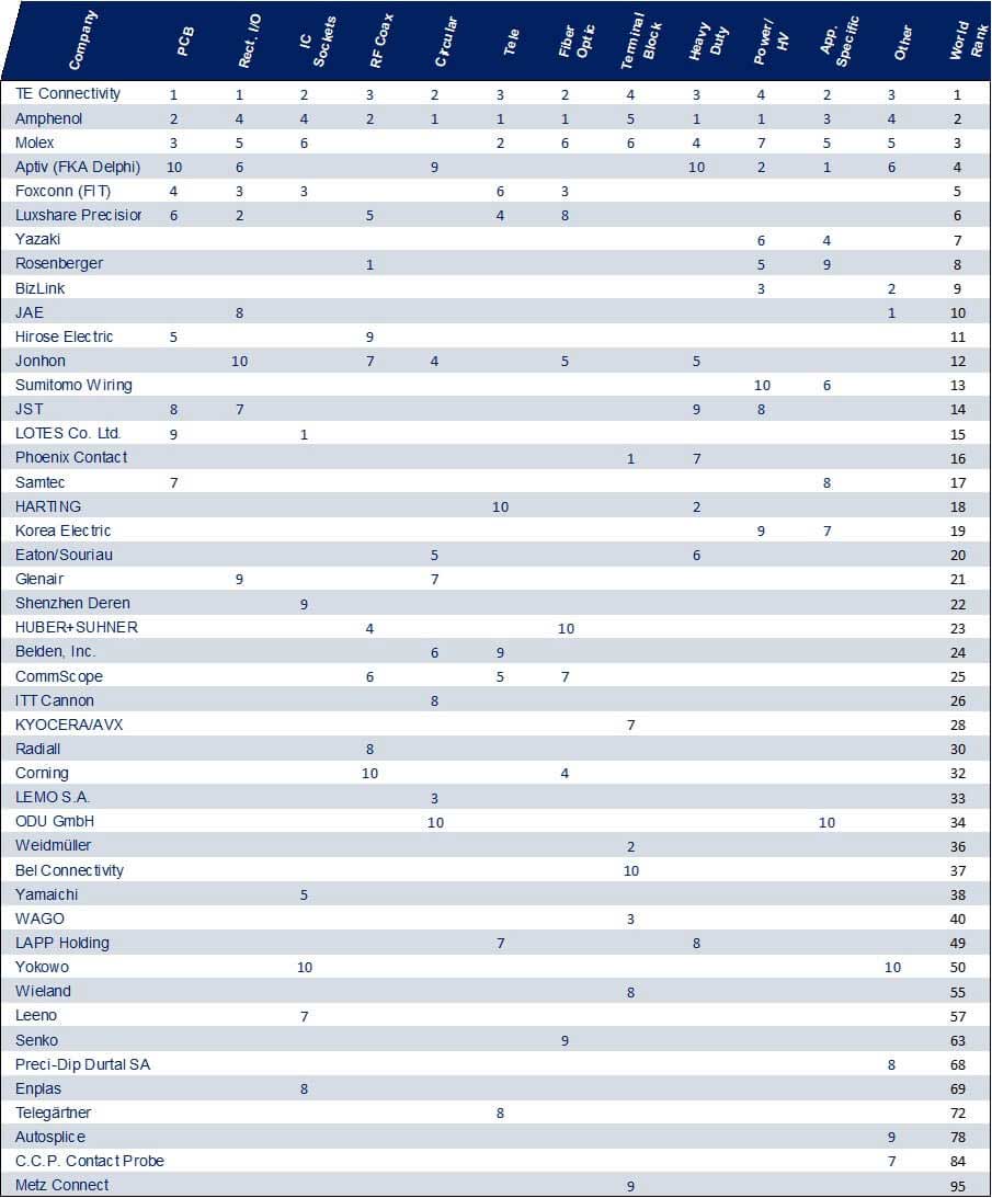 Table 1: Top 10 connector manufacturers by product type (2024)