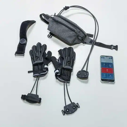 Unlike many existing orthoses, MotionMate’s development focuses on low weight and user-friendly handling, with the aim of enabling users to put on the device independently. Batteries and actuators are housed in a separate belt pack (650 g), keeping the orthosis itself light at 160 g. Depending on the user’s level of impairment, the system is controlled via movement signals from the user. A Bluetooth-connected control unit can be attached at different body locations, such as the chin, elbow, or the opposite hand. The system can also be operated via a smartphone app or by voice commands.