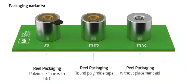 - WA‑SMSI series: SMT spacers with internal thread for screw mounting into the spacer.
